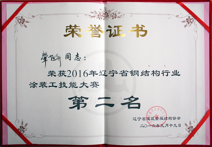 2016年9月19日,由遼寧省建筑金屬結(jié)構(gòu)協(xié)會(huì)主辦的遼寧省鋼結(jié)構(gòu)行業(yè)涂裝工技能大賽圓滿落幕。來自全省10家企業(yè)的20名選手參加了最后的決賽。我公司鋼構(gòu)生產(chǎn)部技工肇旭升獲得第二名的好成績,周文赫獲得榮譽(yù)獎(jiǎng)。