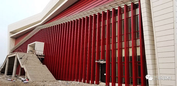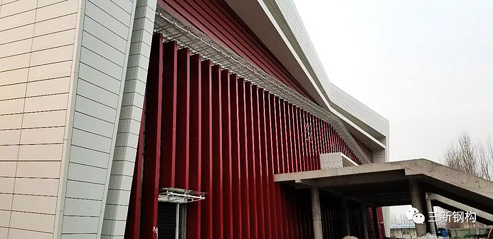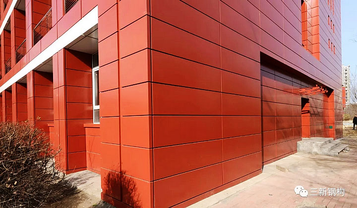 2、項目采用開放式金屬幕墻系統(tǒng),凹槽、洞口、窗口、弧形造型、傾斜面折線、波紋造型的方案設(shè)計,金屬板采用磚紅色金屬板,生產(chǎn)后直接發(fā)運至現(xiàn)場安裝,金屬板顏色種類豐富且減少噴涂過程,縮短生產(chǎn)工期;
