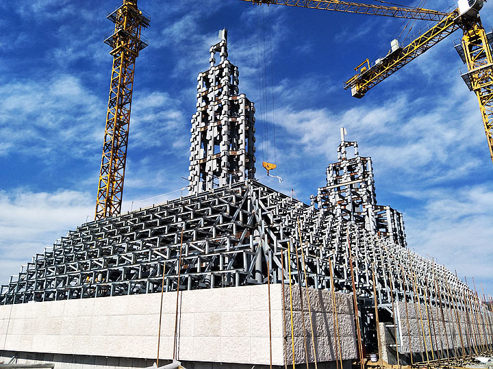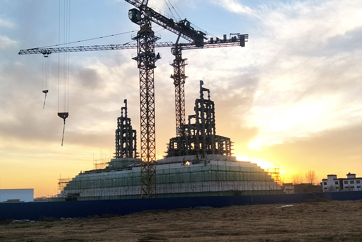 黃帝問道大項(xiàng)目是“帝師之鄉(xiāng)”汝州的重點(diǎn)大型城雕項(xiàng)目,也是當(dāng)?shù)氐貥?biāo)性建筑。該項(xiàng)目肩負(fù)著弘揚(yáng)汝州歷史文化和華夏文明的重任,承載了太多榮耀和希冀。雕像基底面積1400平方米,人像總高度59.8米,主體結(jié)構(gòu)采用圓管鋼框架,外側(cè)采用干掛石材雕塑,總用鋼量2300噸,設(shè)計(jì)使用年限為100年。雕塑內(nèi)部水、電、消防配套齊全。要用鋼結(jié)構(gòu)、石塑傳神地塑造中華民族敬為人皇的黃帝雕像,不失神韻和靈氣,其難度可想而知。三新不負(fù)重托,攻克所有的技術(shù)難題,把大師畫卷中的意象用建筑語言完美呈現(xiàn),體現(xiàn)了三新建筑技術(shù)與藝術(shù)完美融合的建筑理念。施工過程中汝州市政府各級(jí)領(lǐng)導(dǎo)多次到現(xiàn)場檢查指導(dǎo),對工程質(zhì)量贊賞有加。我們一起見證了精品的煉成,其中凝聚了三新人的心血和智慧,更體現(xiàn)了三新的創(chuàng)新精神。如今被評為“中國鋼結(jié)構(gòu)金獎(jiǎng)”工程,更是實(shí)至名歸。三新帶您一睹黃帝風(fēng)采,領(lǐng)略華夏文明。