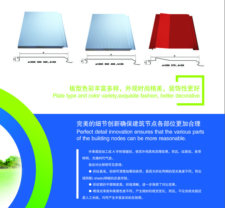 SX-400幕墻板創(chuàng)新的節(jié)點結(jié)構(gòu),獨(dú)特的安裝方式,確保外墻的墻面、墻角全無釘。使用三新工業(yè)金屬幕墻板建筑外墻,整潔、美觀,可以達(dá)到理想的建筑表面裝飾效果??茖W(xué)嚴(yán)謹(jǐn)?shù)捻椖抗芾砉ぷ魇谴_保工程安裝能真實地符合三新集團(tuán)金屬建筑系統(tǒng)技術(shù)體系要求的根本保障。
