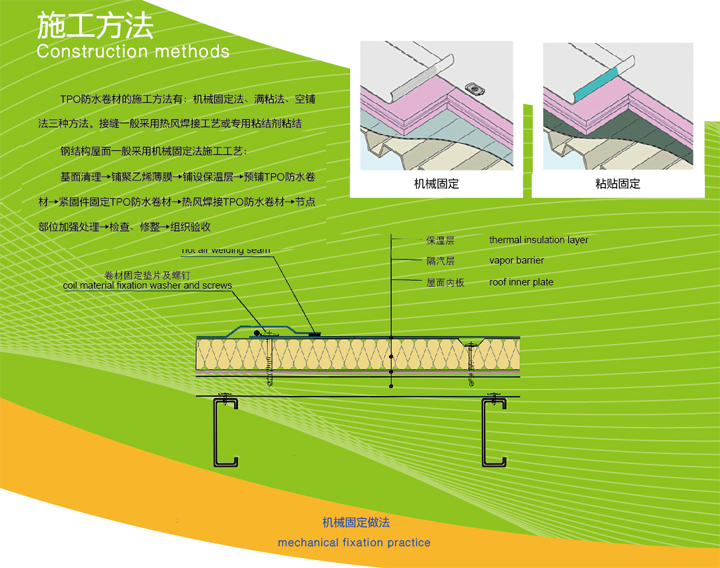 為確保卷材防水層在屋面的整體性,關(guān)鍵之一是搭接處理,通過熱焊接使相鄰卷材搭接形成高于卷材強度的粘結(jié)層,形成卷材整體的連續(xù)密封防水層。 TPO卷材與屋面的固定方式: